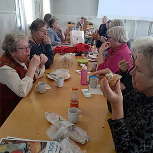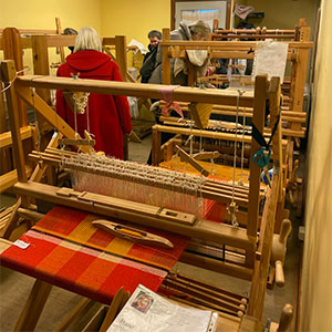 Totalt finns 14 vävstolar och just nu 14 medlemmar. Vävstugan innehåller allt från vana vävare till noviser som träder in i denna gemenskap av skapande, glädje, avkoppling och strålande lycka över fina resultat. I höstas sträckte sig vårt medlemskap från en manlig 27-åring till kvinnlig 96-åring.