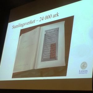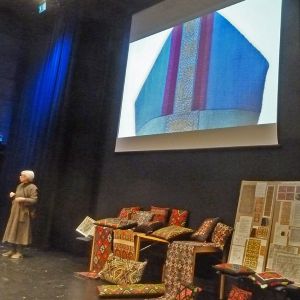 Nästa föreläsare var Gunvor Johansson som visade hur uråldriga mönsterformer, som finns i våra skånska textilier, har inspirerat henne vid skapandet av moderna kyrkliga textilier.